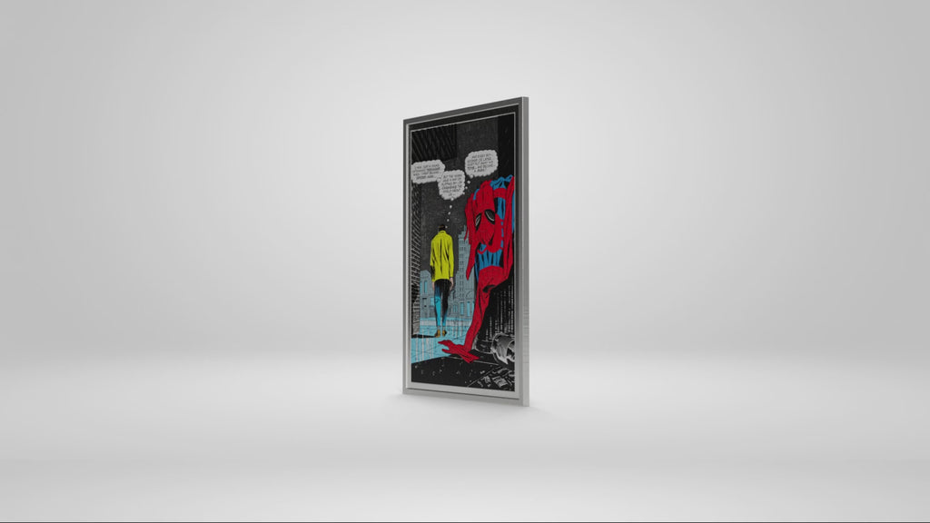 The classic spread from Marvel Comics’ Amazing Spider-Man #50 shocked readers worldwide, showing Peter Parker walking away from his superhero life on rain-slicked streets. Now immortalised in silver as the second release in our Iconic Moments series, this collectible is minted in 1oz of pure 999 silver and reproduces the original dialogue and vintage-coloured details. A must-have for all Marvel Spider-Man collectors.