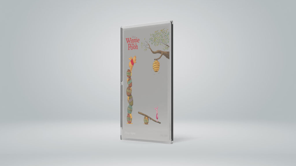Journey to Hundred Acre Wood with this 5g foil in 999 pure silver. Winnie the Pooh from The Walt Disney Company is captured in the midst of a charming honey hunt – a scene that reflects the warm and peaceful world surrounding Christopher Robin. The motif is rendered in vibrant colours on a gleaming silver background.